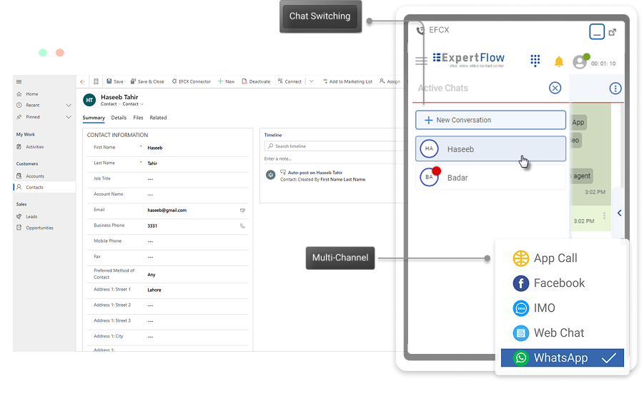 Customer profiles automatically pop up for incoming calls or chat sessions, or as defined in an outbound campaign. Manage agent availability and omnichannel media (voice, video, chat) directly within MS Dynamics. Agents login to the CRM only.