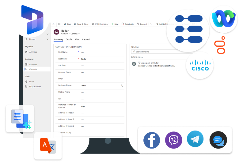 Integrate your business communication (Cisco CUCM, Webex Calling) and high-volume contact center operations (Cisco UCCE, PCCE, UCCX, Webex, Genesys or Expertflow) directly within MS Dynamics (Cloud & On Premise)