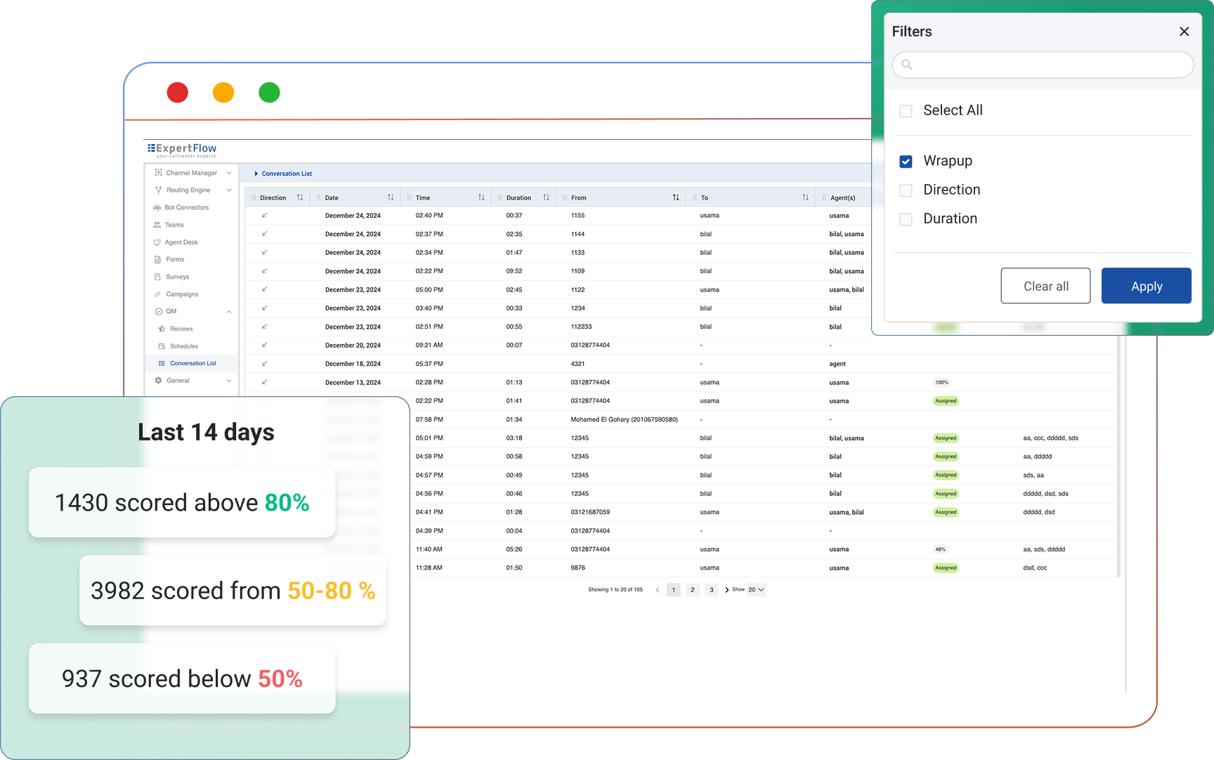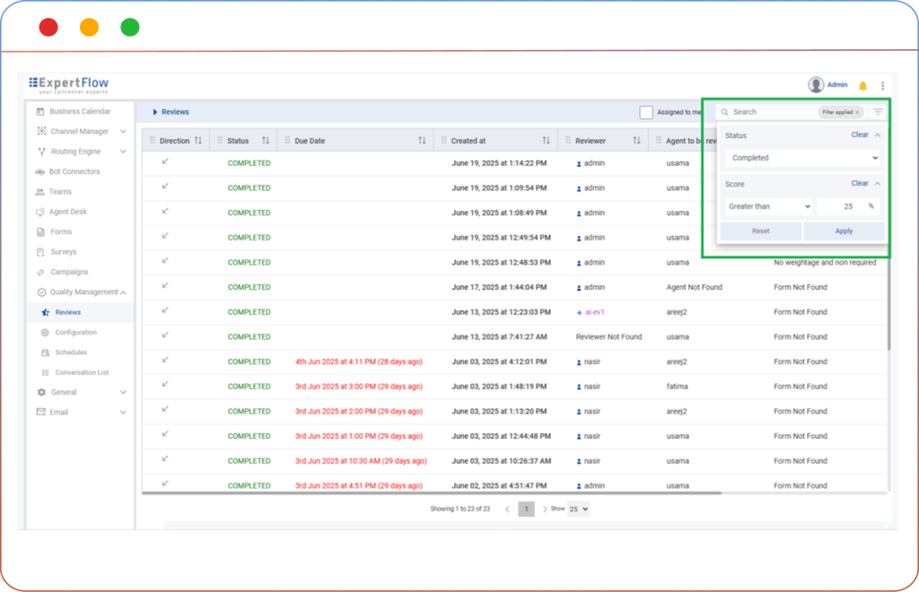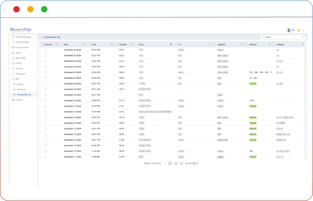 Filter conversations using agent, team, date/time, wrap‑up code, direction and sentiment via the Conversation List. This enables Quality Managers to quickly identify relevant conversations and focus evaluation efforts where they’re most needed.