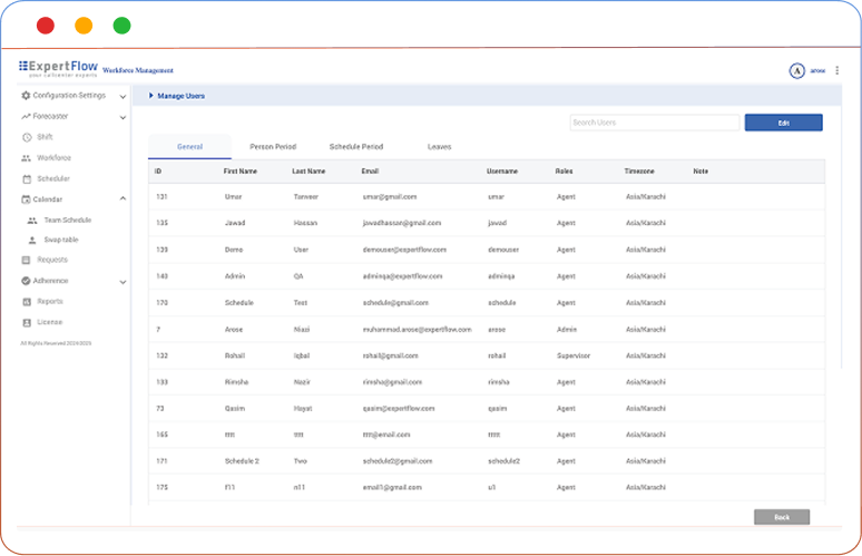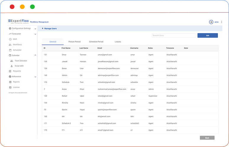 Organize teams, roles, and eligibility in a single structure. Supervisors manage user records, contracts, skills, and schedule periods while leave balances and status flow automatically into scheduling.